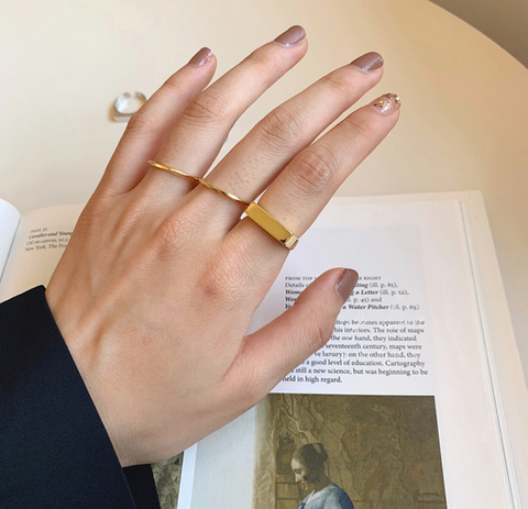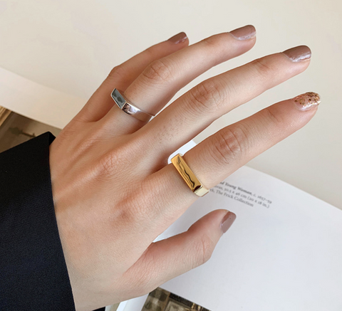 Delicate and stylish, this ring is perfect for any fashion-savvy woman. The sleek rectangle design is eye-catching and unique, while the accompanying rings add a touch of elegance. Choose between gold or silver to perfectly match your look.